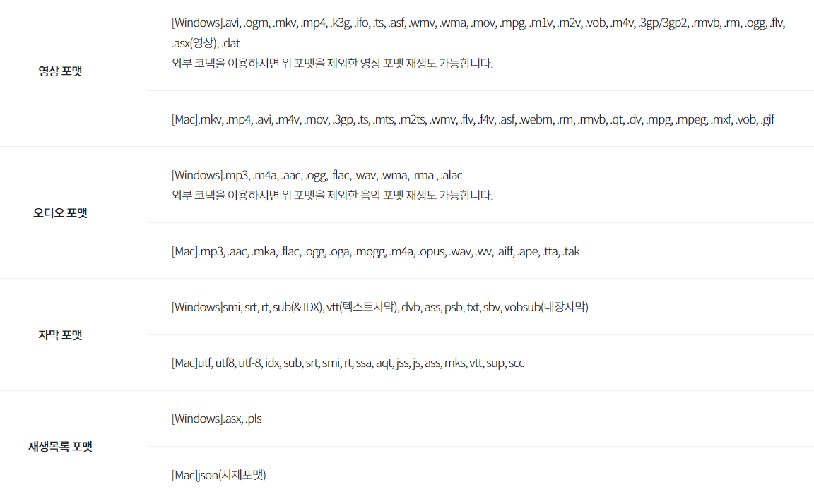 ✔ 영상은 avi, mkv, mp4, wma, mov 등 대부분의 영상파일을 제공하고 오디오 또한 mp3, mp4, mov 등 음성파일을 제공합니다.