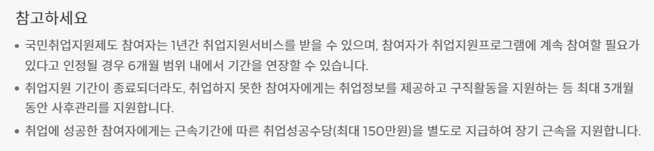 7. 사후관리로 미취업자는 취업지원서비스 종료일로 부터 3개월 동안 구인정보제공 등 사후 관리가 이루어지고 취업자는 장기근속 유도를 위한 취업성공수당이 지원됩니다.