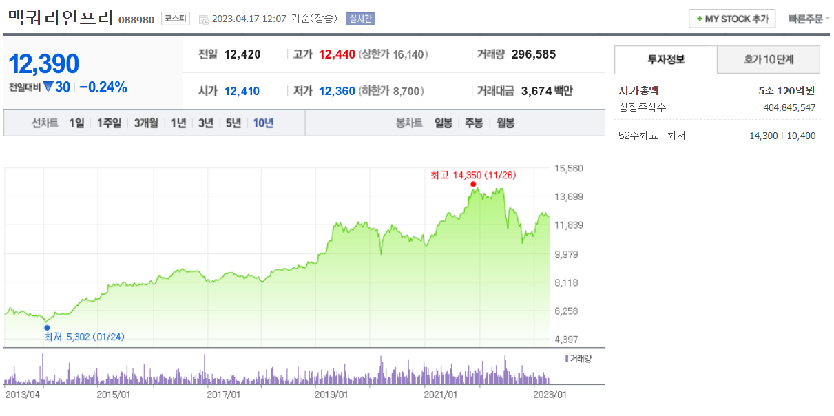 맥쿼리인프라 10년 주가를 보면 최저점은 2014년 1월 중 5,302원 최고점은 2022년 11월 14,350원을 보였다. 그래프에서 보는 바와 같이 꾸준히 우상향하는 모습을 볼 수 있고 배당금 또한 2013년 513원에서 2022년 770원으로 꾸준히 상승해 왔음을 볼 수 있습니다.(배당 관련 자세한 내용은 아래 링크 참조)