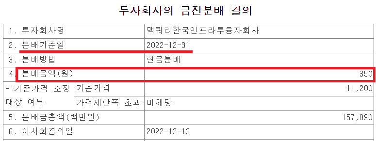 | 맥쿼리인프라(2022년 하반기) | 390 | 6.21% | 23.02.28 |
