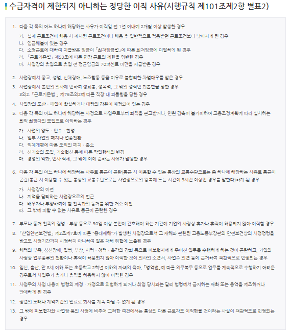 이직사유가 비자발적이어야 하는데 정당한 이직 사유는 시행규칙 제102조 제2항 별표 2에 따라 임금체불, 종교, 성별, 신체장애, 노조활동 등으로 인한 차별대우, 성희롱 등 직장 내 괴롭힘, 사업장 도산 - 폐업 예정, 부모 등 가족의 간호, 건강상의 이유, 임신 및 출산 등의 사유로 퇴사를 하게 된다면 구직급여 지급대상이 됩니다.