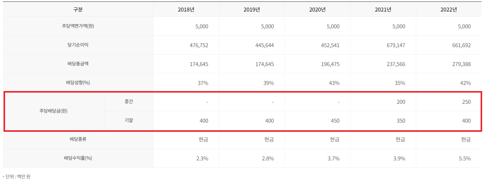 배당은 2021년 이후부터 반기배당을 실시하고 그 이전에는 연배당을 실시하였습니다.