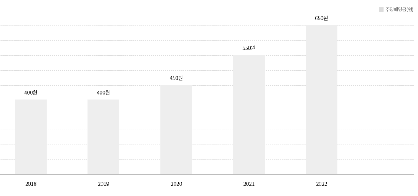 과거 배당지급 내역을 보면 2018년 400원, 2019년 400원, 2020년 450원 2021년 550원, 2022년 650원으로 증가하는 것을 볼 수 있습니다. 2022년 배당수익률은 5.5%입니다.